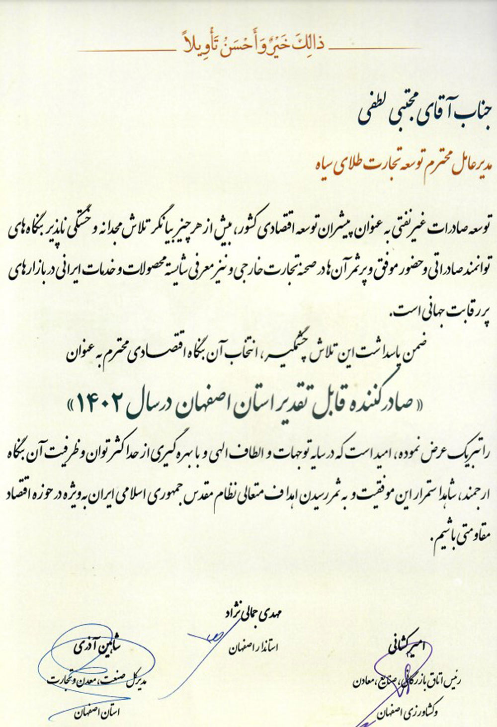 • طلای سیاه در سال های 1401، 1402و 1403 عنوان صادرکننده برتر استان اصفهان، ایران را به خود اختصاص داده است.