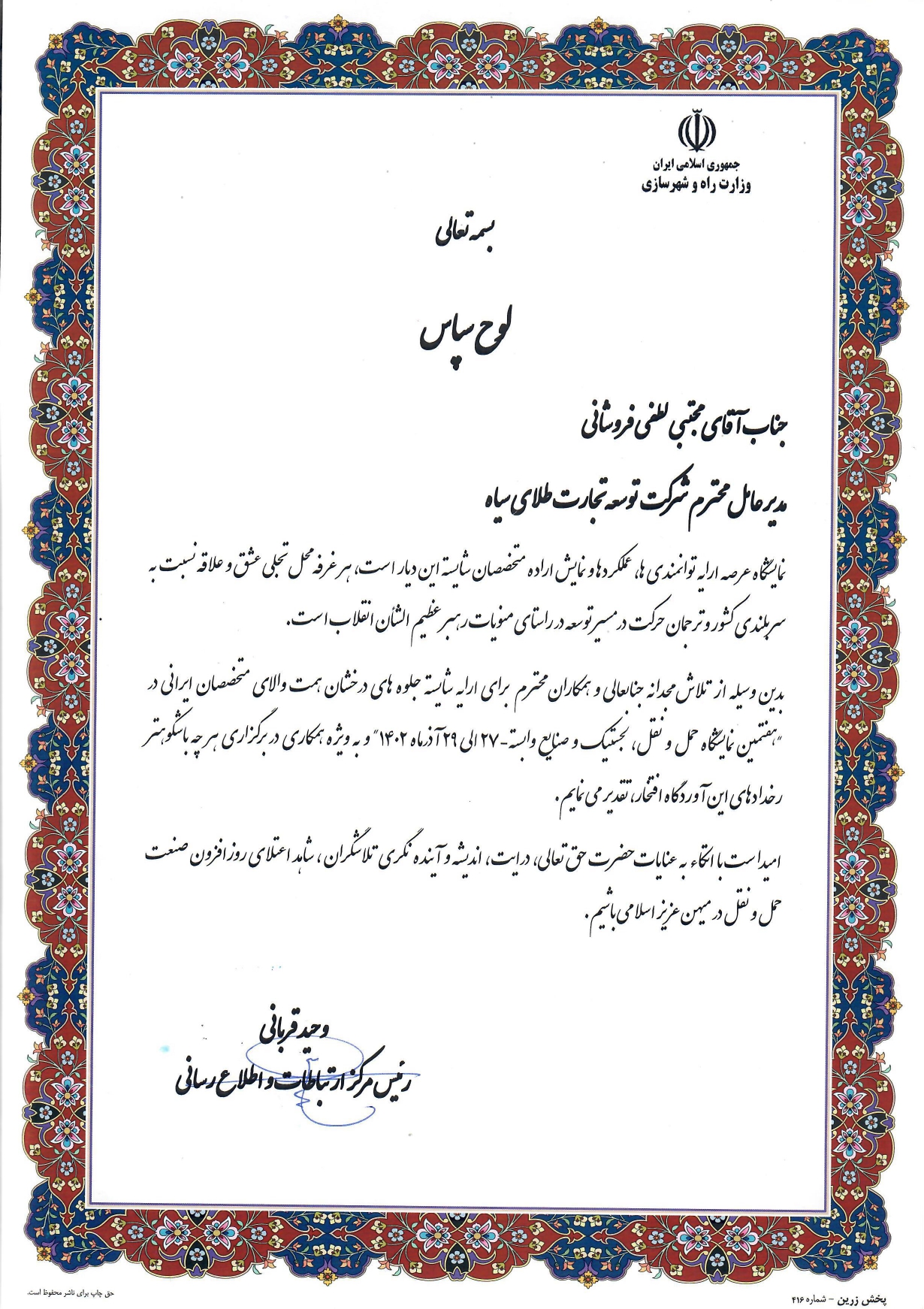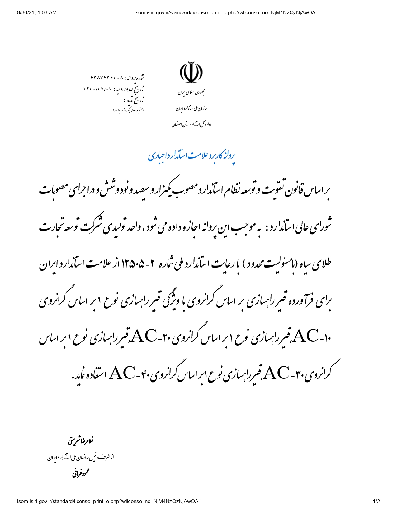 • دارنده گواهینامه اهتمام به کیفیت از سازمان ملی استاندارد ایران.